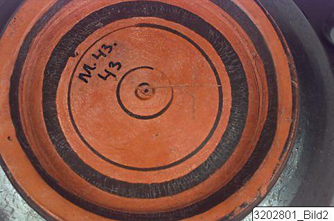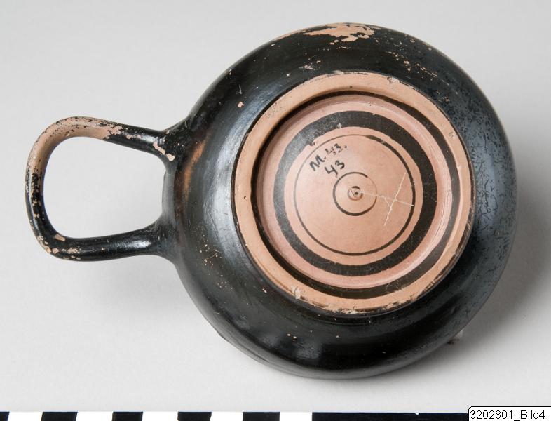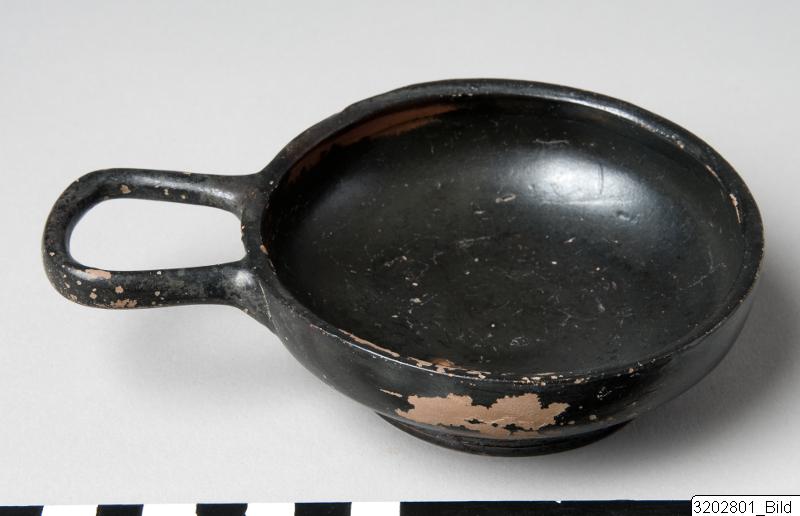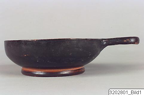 Ring-base; low, shallow body; horizontal rim; oval, slightly raised, horizontal handle on rim. Hard, brick clay; lustrous, black slip. Concentric circles on outside bottom; encircling line above base. Incised sign on outside bottom.