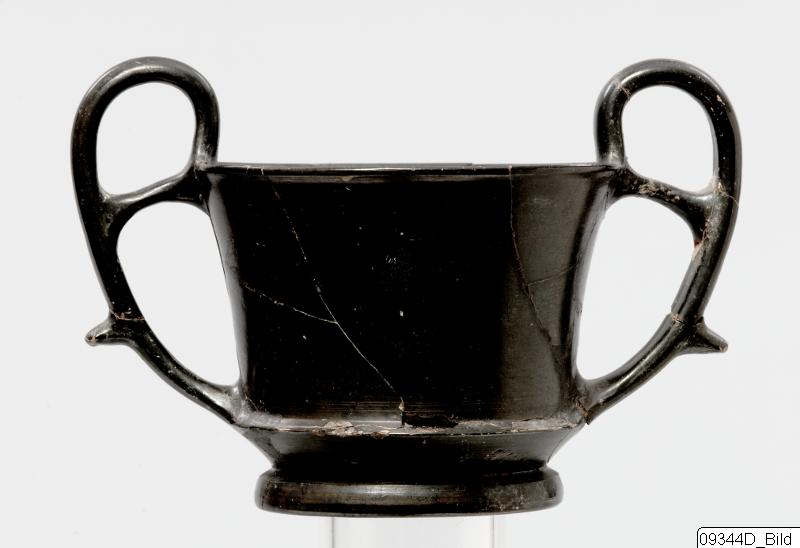 Ring-base; deep body; biconical lower body; mid- and upper body widening upwards; flaring rim; ear-shaped handles, with knob on lower part, from rim to lower body. Hard, brick clay; lustrous, black slip.
