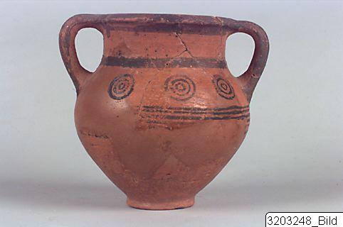 Raised, concave base; depressed ovoid body; wide, cylindrical neck; sloping rim; oval handles from rim to shoulder. Hard, brick clay; lustrous, orange red slip; matt, dark grey paint. Lines encircling mid-body; groups of concentric circles on shoulder; band encircling neck-base; band encircling rim; handles painted.