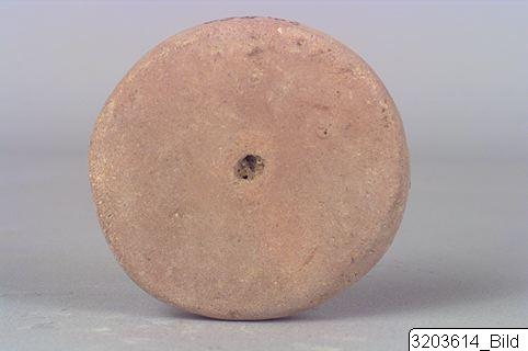• Rather flat; circular; pierced hole in centre; semi-soft buff clay; matt light brownish buff slip.
