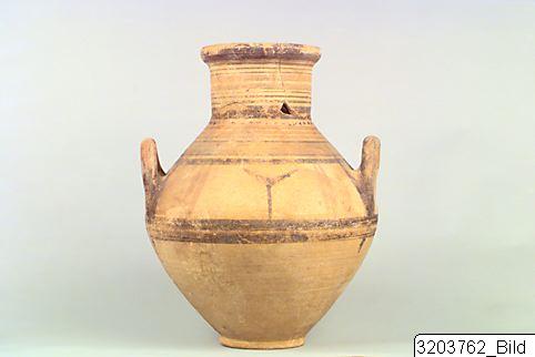Ring-base; biconical body; tall, cylindrical neck; rounded rim; horizontal, raised, round handles on mid-body. Hard, light buff clay; matt, light buff slip; matt, brownish red and dark grey paint. Grey bands encircling mid-body; red, vertical bands from upper body to mid-body; grey palm-tree ornament on either side of mid-body; red bands and grey bands, lines and dots encircling upper body; grey band encircling neck-base; red and grey bands encircling neck; grey band encircling rim; handles painted grey.