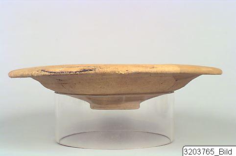 Raised, concave base; shallow, bell-shaped body; wide, horizontal rim. Hard, light buff clay; matt, light buff slip.