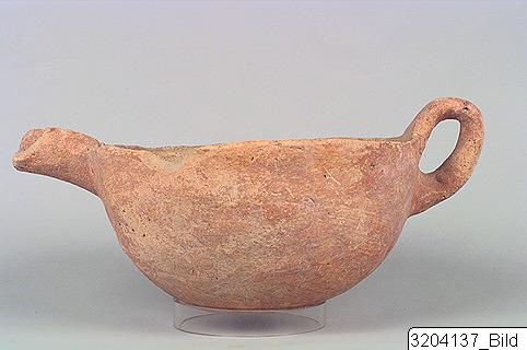 Round base; deep, globular body; plain rim; oval, raised handle from rim to mid-body; open spout opposite handle. Hard, dark buff clay; matt, orange red slip; matt, black slip on inside bottom.