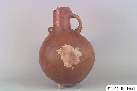 Round base; almost globular body; wide, rather short cylindrical neck; wide slot at neck; thick handle from slot to shoulder; large, angular string-hole with three circular cavities at neck-base opposite handle; two button-ornaments combined by incised rope-ornament on neck; above this a circular button-ornament; circular cavity at top of handle; incised, oblique lines on handle. Hard, pinkish, buff clay; lustrous, red slip.