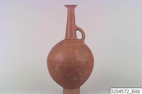 Pointed base; oval body; tall, tapering neck; wide, funnel mouth; round handle from lower neck to shoulder; pinched, parallel relief bands on shoulder. Hard, brick clay; lustrous dark-red slip.