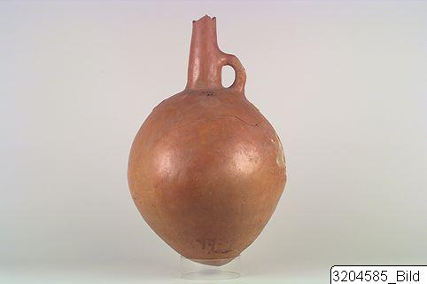 Pointed base; oval body; tall, tapering neck; oval handle from lower neck to shoulder; four button-ornaments on shoulder. Hard, brick clay with grey core; lustrous brownish red slip.