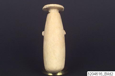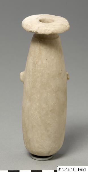 • Round base; body tapering upwards; short, concave neck; wide, flat rim with sloping edge; small, vertical knobs on upper body. Semi-lustrous, light buff alabaster.