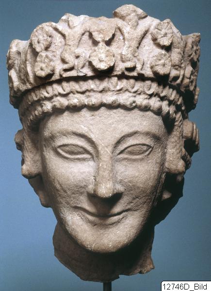 Head belonging to a lifesize statue. Softly triangular head with slightly smiling mouth following the curve of the chin. Rather thin, rounded lips. Ridged eyebrows, lancet-shaped eyes with long tearducts, slightly tilted towards the nose. Long, slender, pointed nose with flaring, carved nostrils. High cheekbones. Smooth, vertical brow. Wearing high diadem/kalathos with dancing figures alternating with double rosettes (one on top of the other). The figures have bent knees, with legs depicted in profile and torso en face, arms stretched upwards, with joining hands; wearing knee-long tunics with belts. Below the kalathos is one row of kymation ornament, and one row of spiral hair-curls. In front of each ear is a thick twisted curl with upturned end. A mass of wavy hair at back of head. Large earrings with pendants. Traces of necklaces.