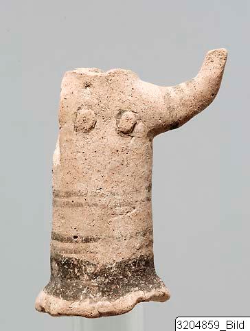 Female figurine; hollow, cylindrical body; two circular pellets as breasts; left arm raised. Hard, light buff clay; matt, buff slip; matt, black to dark-grey paint; wide band encircling base; lines encircling lower body; circles around breasts; lines encircling left arm.