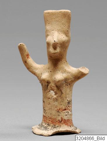 Female figurine; hollow, cylindrical body; two protruding breasts; both arms raised; face roughly modelled with nose and eyes producing a bird-like effect; erect headdress (polos) flat and rectangular. Hard, light buff clay; matt, dark-grey and red paint; wide red and dark-grey bands encircling base and lower body. Painted lines on arms, a bichrome latticed triangle and two crossed black lines on breasts are worn off!