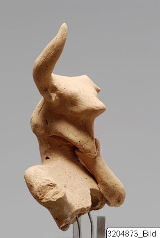 Masked, male figure; left arm lifting big mask of bull’s head covering his own head; bull’s head has curved horns and bulging eyes; curved pellet ears; brisket; rather pointed nose without mouth and nostrils; male figure has broad, horizontal shoulders; pointed beard is visible below mask. Hard, pinkish buff clay.