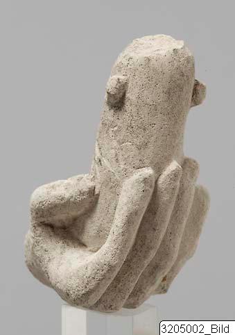 • Hand with bent fingers holding an upright aryballos with two knob-handles. Upper part of aryballos missing. Marked fingernails. White limestone.