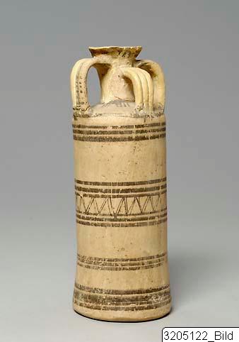 Cylindrical body, flat base, short, narrow neck with flaring rim. Three vertical, triple-ridged handles from neck to shoulder. Decoration in black paint. Groups of horizontal lines divide body into zones; from top, zone with vertical bands of framed zigzags or dotted lozenges with an isolated “loom-motif” opposite handles: zone with horizontal, double zigzag; zone similar to first with framed, vertical bands of dotted lozenges and above base, solid-filled triangle on “front”. On the interior, encircling lines below rim. At base of neck, a band with pendant groups of lines.
