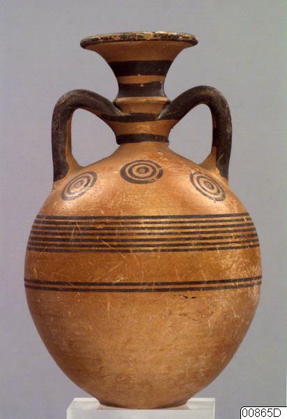 Globular jug with slightly raised base; narrow neck with handle ridge; flaring funnel-rim, and two handles from neck to shoulder. Encircling lines around rim, neck and belly; concentric circles around shoulder; black handles.
