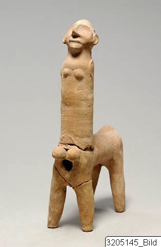 Minotaur with cylindrical human and animal bodies (The centaurs from Ayia Irini are referred to as minotaurs by Gjerstad since they have human head and torso, and the body of a bull instead of a horse). Tail on hind quarters. Large male genital organs. Female pellet breasts. Rhomboid, roughly shaped head. Pellet ears, curved nose, pellet mouth. No marked eyes. Ridged eyebrows on rudimentary forehe...
