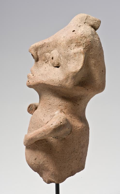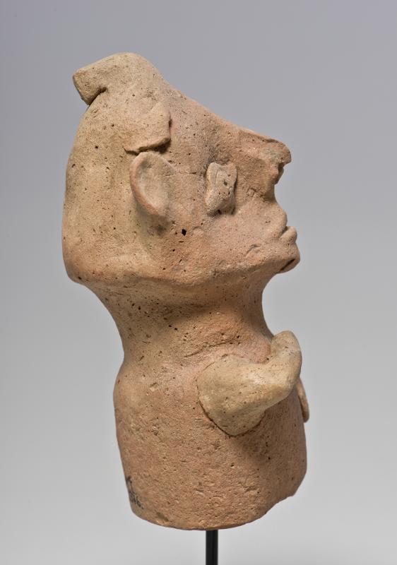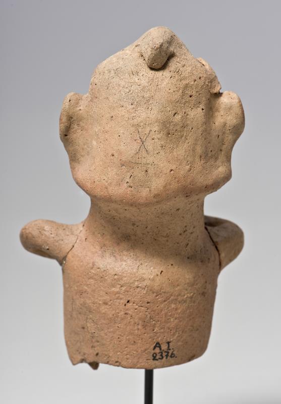 Human part of minotaur statuette with cylindrical body (The centaurs from Ayia Irini are referred to as minotaurs by Gjerstad since they have human head and torso, and the body of a bull instead of a horse). Narrow, cylindrical arms bent over breast. Pentagonal, roughly shaped face with rounded, triangular beard. Parted lips. Projecting, thin nose with indicated nostrils. Sides of face sunk in. “Fish-eyes” added as pellets with central dot. Pellet ears. Sloping, short forhead. Head covered by soft cap with top bent back.