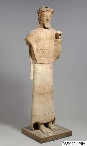 Male statue with isolinear feet, attached to a base tablet. Flat body, in two halves; the lower part with a collar at the upper end for keeping upper part in place. Bulging breast, sloping shoulders. Right arm was vertical. Left arm is bent; the hand was holding object (sacrificial knife?). Cylindrical neck, broad, trapezoid head, square-cut beard. The plaits are indicated by contiguous, vertical bands of incised chevrons. Somewhat protruding mouth with slightly smiling lips. Nose with curved, broad tip, almond-shaped eyes, eyelids in relief, curved eyebrow lines, rather straight, broad forehead. Ears with terracotta earrings. Hair covered by a veil falling along neck towards shoulder and kept in place by a twisted band. Back-hole and hole on top of head. The figure is dressed in a long chiton of which the upper border is marked by two incised lines and lower border by a broad band with incisions of oblique lines and a triangle in the middle. Above the chiton a short mantle, thrown around both shoulders and left arm, falling along back. Traces of red and black paint on beard and mantle.