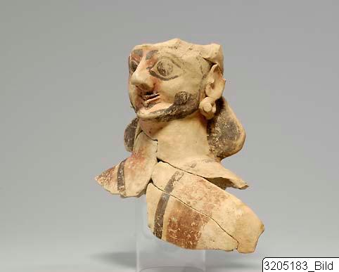Upper part of male statuette with almost cylindrical neck, trapezoid head, projecting, triangular chin, smiling mouth with protruding, angular lips. Full cheeks. Short, thick nose. Roughly modelled ears with earrings. Almond-shaped eyes (painted, not modelled) with large irises. Hair falling in a compact mass at back of head and along sides of neck, turban around head. Handmade, in the strip-technique. Skin painted red, beard, hair, moustach, iris, lids, eyebrows painted black. Dress is red whith converging black lines and deep-red bands. Brown clay.