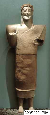 Statue made in two separate halves. Almost isolinear feet, straight legs and upright body. Very wide, almost horizontal shoulders. Right arm was raised in greeting, left arm was bent and directed forwards. Powerful neck, oval face with plain, black beard and moustaches. Nose somewhat deformed. Large, elliptical eyes, sculpturalyy marked with lids painted black as the eyebrows. Front-hair arranged in small, vertical cork-screw curls made separately and attached to the head; the plaits on either side of neck, painted black; ivy wreath in hair. Long, plain chiton reaching below the knees; half-length himation hanging over left shoulder, leaving both upper arms uncovered; vertical edges of himation hang from right elbow. Boots painted red. One back-hole in upper half.