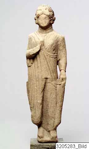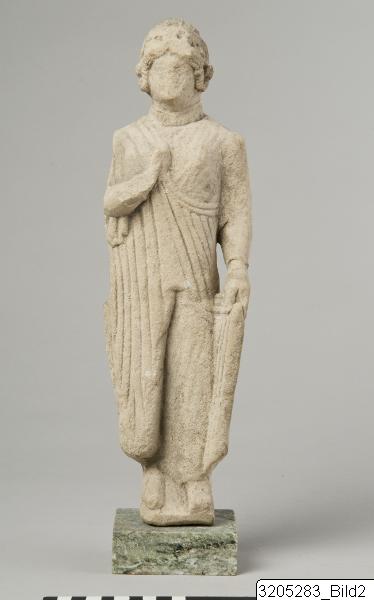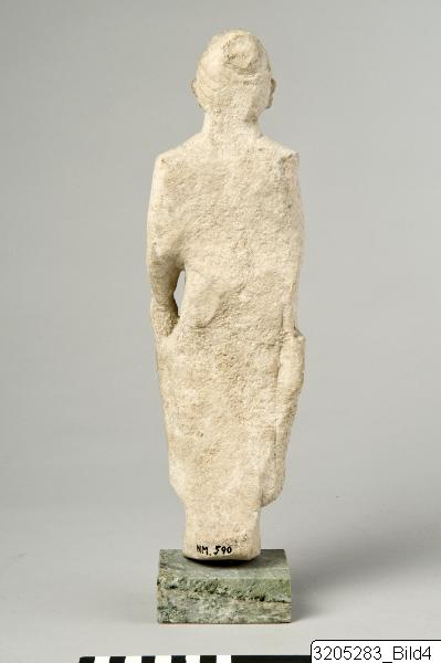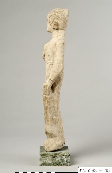 Female standing on a small base with left foot slightly advanced. Left arm is partly free from body, slightly bent, and left hand is holding folds of himation. Right arm is bent, right hand (now missing) was holding object between breasts. Wearing collar necklace with pendant, bracelets around each wrist, and circular earrings. The hairstyle is elaborate, with front-hair parted in the middle and a bun at back, held in place by hair-bands. Short-sleeved chiton (ending at elbows) and himation with carefully rendered folds over right shoulder and around waist. The back is rather flat, and hardly worked.