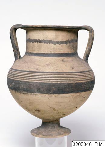 Conical base with conical cavity underneath. Globular, depressed body. Wide, cylindrical neck. Wide, horizontal rim. Flat handles from rim to shoulder. Hard, light buff clay, matt, light buff slip. Matt, black paint: Base painted. Band and lines encircling mid-body. Band encircling neck-base. Wavy line encircling mid-neck. Lines encircling rim. Handles painted. Lines encircling inside of neck. Dar...
