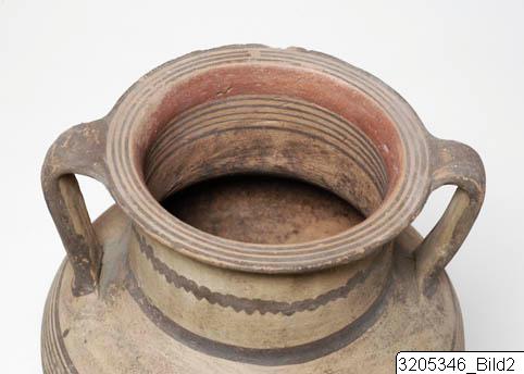 Conical base with conical cavity underneath. Globular, depressed body. Wide, cylindrical neck. Wide, horizontal rim. Flat handles from rim to shoulder. Hard, light buff clay, matt, light buff slip. Matt, black paint: Base painted. Band and lines encircling mid-body. Band encircling neck-base. Wavy line encircling mid-neck. Lines encircling rim. Handles painted. Lines encircling inside of neck. Dark red paint: Band encircling upper neck on inside.