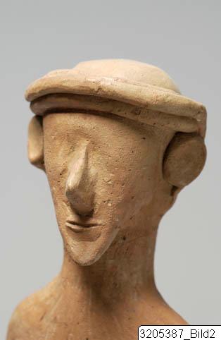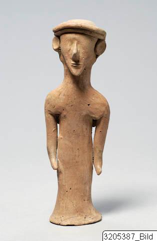 Statuette with tubular, wheel-made body. Splayed base. Vertical arms. Undigitated hands. Sloping shoulders. Cylindrical neck. Trapezoid head. Pointed, rounded beard. Incised pellet mouth. Thin, projecting nose. Pellet ears. Sloping forehead. Hair plain and raised on back of head. Triple band around head. Dressed in shawl. Brown clay, reddish slip.