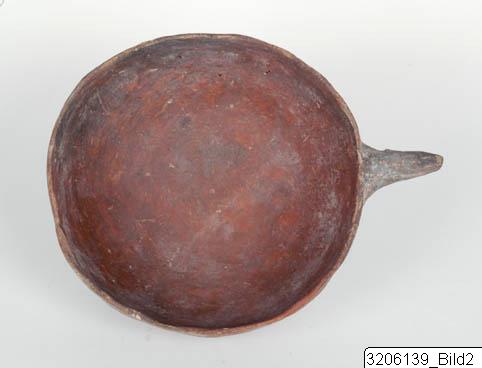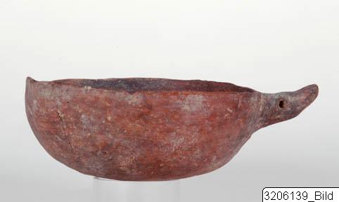Shallow bowl with almost straight sides. Almost rounded bottom. Slightly raised, beak-shaped handle on rim with eye-like projections. Red-brown clay, black-red slip.