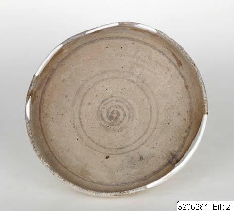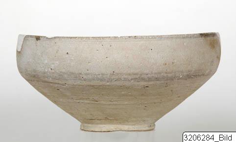 Plain rim. Gently curved sides. Upper body convex. Conical lower body. Semi-deep bowl. Base-ring. Black band encircling rim. Encircling black lines outside and inside.