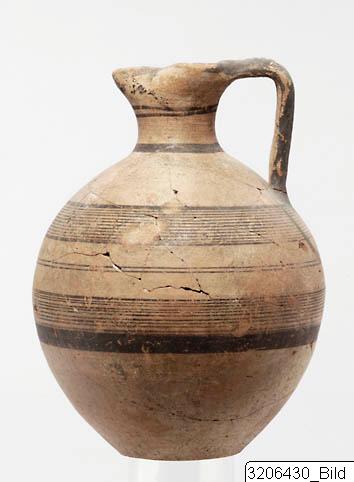Small ring-base. Ovoid body. Short, concave neck. Trefoil mouth. Flat handle from rim to shoulder. Band encircling rim. Two lines encircling upper neck. Band encircling neck-base. Thirteen lines encircling upper body, below handle. Two lines encircling mid-body. Eleven lines and one band encircling lower body. Transverse strokes on upper part of handle. Vertical wavy line below transverse strokes....