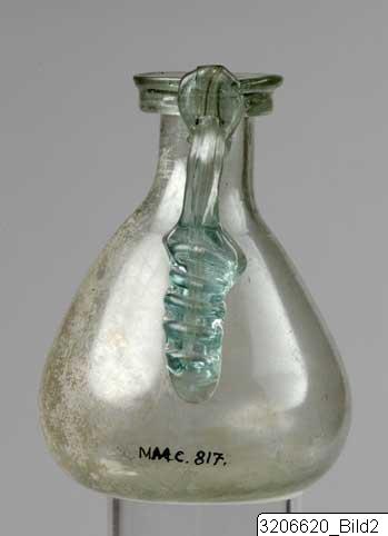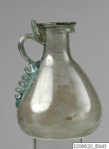 Small free blown jug. The rim is profiled, a small neck and a piriform body ending in a flat standing point. The handle of darker green glass is folded towards rim and neck curving to the body where a broader glass thread has been pressed inwards with an instrument creating a stepped decoration. Pale green glass with darker green decoration.