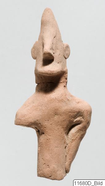 Statuette with solid, cylindrical body. Slightly bulging breast. Rather horizontal shoulders. Arms along sides. Hands not shaped. Trapezoid head. Pellet ears. Pinched nose. Long, rounded beard. Short, narrow helmet. Red-brown clay. Light brown slip.