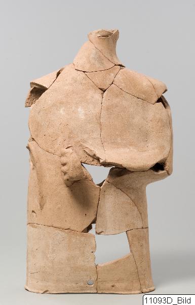 Upper body of more than half life-size hollow sculpture. Wheel-made. Rather horizontal shoulders. Left arm bent at elbow and resting across body. Closed hand with modelled fingers. Curved ridge at right side of body, showing position of rightarm. Narrow handmade neck. Back-hole. Small hole at lower front edge. Yellowish-brown clay.