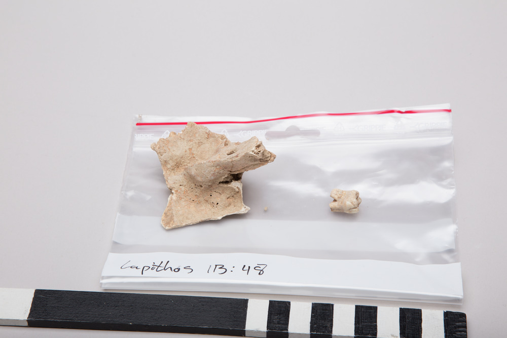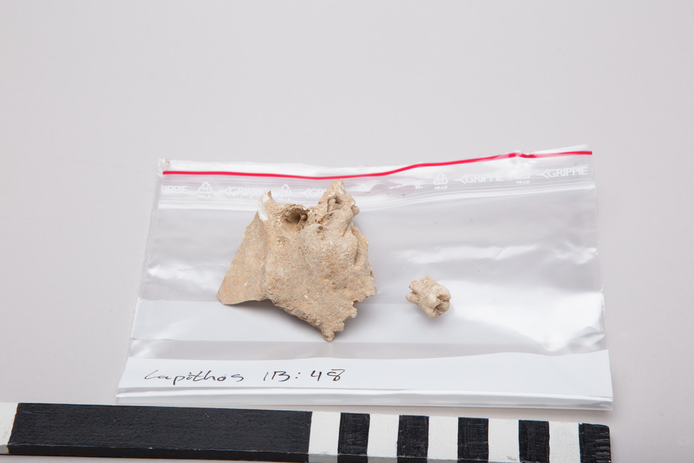 According to notes found together with the present material the origin is ”Lapithos T8, 14-15”. The above mentioned tomb number is based on an inscription, T2, on the present cranium. None of the numb...