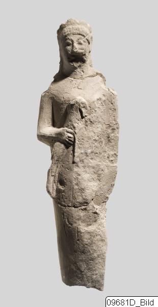 Male statuette with plank-shaped body (no 82). Left arm almost vertical along side of body, with closed hand. Right arm bent over breast, its hand holding a buck around its body. Head wearing a wavy diadem with curled hair below. The hair falls in a compact mass at back of head leaving the ears uncovered.