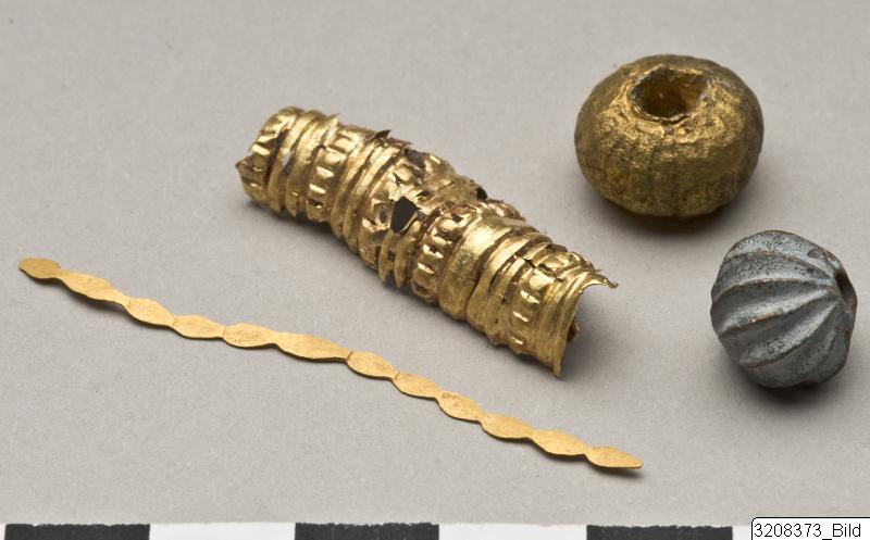 3 strayfinds collected together in a box; 2 pearls one in gold and one blue, and a thin strip.