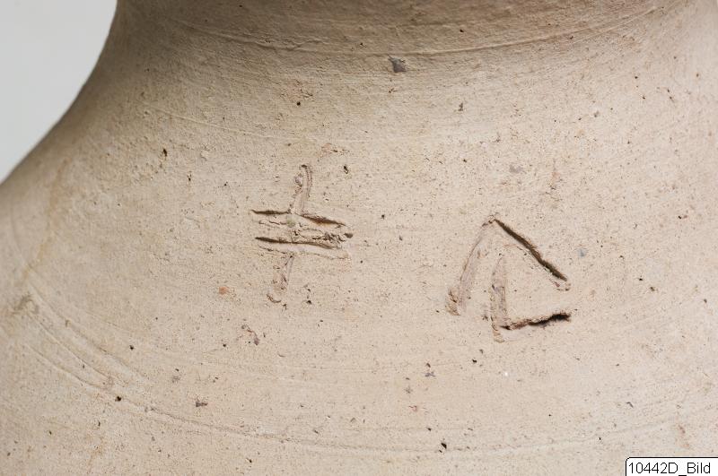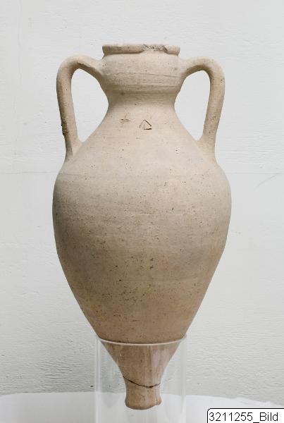 Swollen rim. Short, swollen neck. Bobbin-shaped body with knobbed base. Vertical handles from neck to shoulder. Graffito on shoulder. Reddish-brown clay.