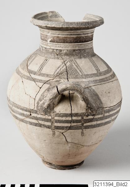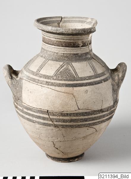 Flaring rim. Slightly concave neck. Oval body with base-ring. Horizontal handles on shoulder. Encircling lines and bands round rim, neck, shoulder, belly and base. Framed lattice triangles on shoulder.