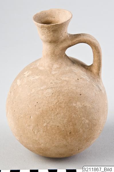 • Collar-shaped mouth. Narrow, slightly concave neck. Spherical body. Handle from neck to shoulder. Buff clay.