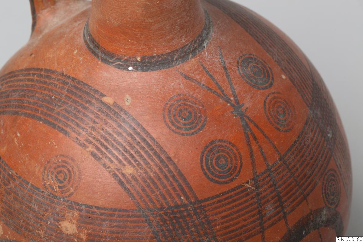In-turned, pinched rim. Twin-handle from rim to shoulder. Cylindrical neck. Low ridge encircling neck-base. Globular body. Ring-base. Red clay. Red listrous slip. Dark, matt paint. Decoration: Concentric circles, with smaller concentric circles inside, on either side of body. Groups of concentric circles and three crossed lines on body front. Lines encircling upper body. Band encircling neck-base. Lines encircling upper neck. Band encircling rim. Sides- and middle of handle painted.Stäng