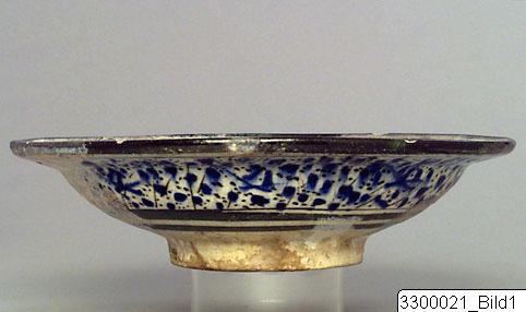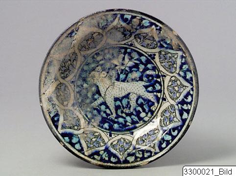 Flaring sides, large flattened rim, low foot. Pinkish gray fabric (7.5 YR 7/2). Cobalt blue, black, dark green and turquoise glaze on white slip, under transparent glaze. Exterior, blue and black dots within green concentric borders. Interior, central medallion, a leopard reserved in white, outlined with green and greenish gray dots on body, is walking in a blue background with white and turquoise foliation. The rim has is outlined with green, contains ovoid leaves filled with blue and white foliation on a black and white background, around these leaves, turquoise-blue foliation on blue background. Iridescence.