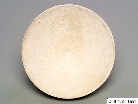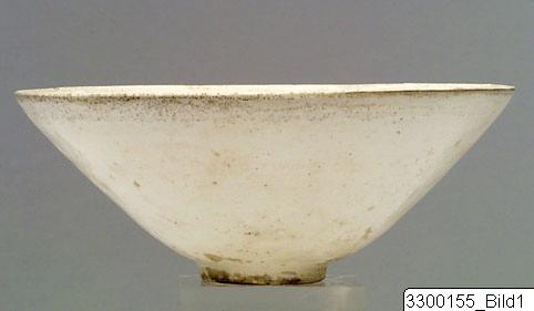 Conical shape, slightly flaring sides, low foot. Extremely fine white paste, moulded under opaque white glaze. Exterior, plain. Interior, Central rosette, outlined by a succession of concentric bands; band with hearts, flowers on a foliated background, band of hearts, upper band of meanders.