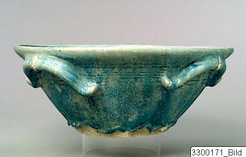 Conical shape, straight sides, incurved rim, flat unglazed base. Pale yellow paste, turquoise-blue glaze, carved oranmentation. Exterior, band of incisions under four handle-like reliefs (ref. metal works). Interior, central medallion, decoration indistinguishable, interior walls up to rim, pairs of petals flanking an oval fruit, pairs intersected by three fruits between petals inclined on a foliated background. Rim, succession of rectangles.