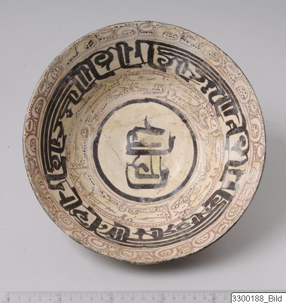 Fatet är dekorerat med arabisk kalligrafi. Det finns många kalligrafistilar. Här ser vi en förenklad kufisk skrift, som är en av de äldsta av de etablerade kalligrafistilarna. Kufisk skrift är uppkallad efter staden Kufa i Irak. Den finns i flera varianter men känns igen med sina tjocka jämna geometriska former. Fatet är daterat till ca 800–900-talet och tillverkat under samanidiskt styre. Samaniderna härskade över ett stort landområde från Afghanistan till Iran. Det var en persisk dynasti som förvaltade och vidareutvecklade arabisk kultur, vilket syns i konsten. De tre största samanidiska städerna Bukhara, Samarkand och Nishapur var centrum för konst, litteratur och handel. Flera samanidiska mynt har hittats i Birka här i Skandinavien.