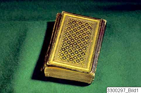 • Binding, dark brownish red leather with stamped and gilded geometrical decoration.