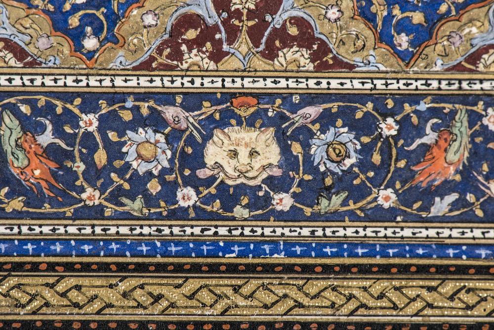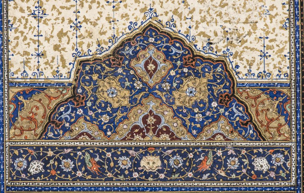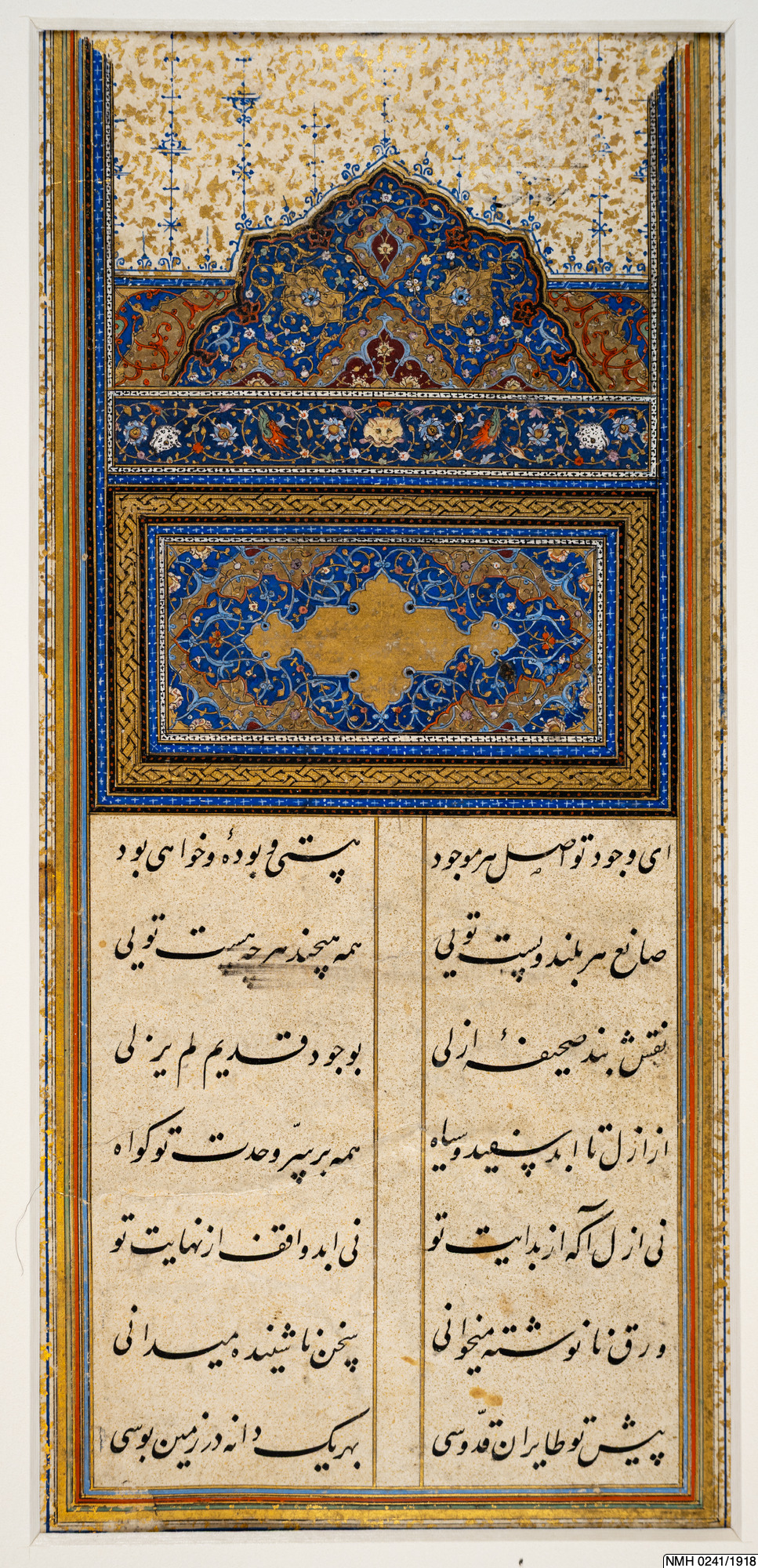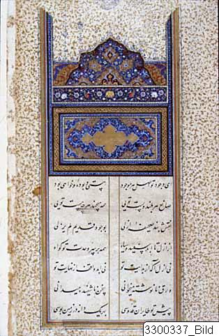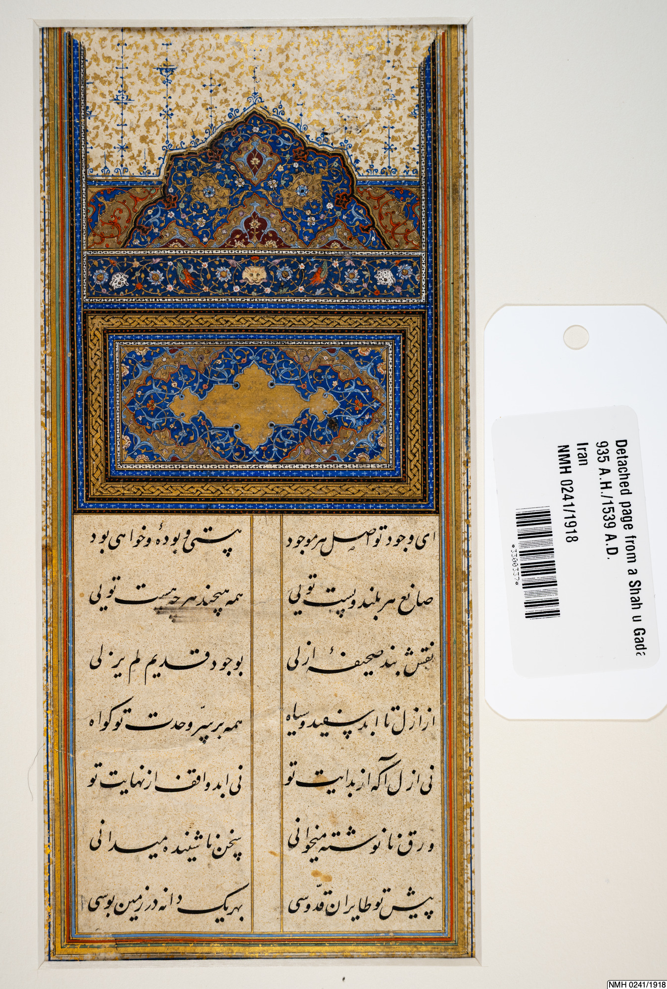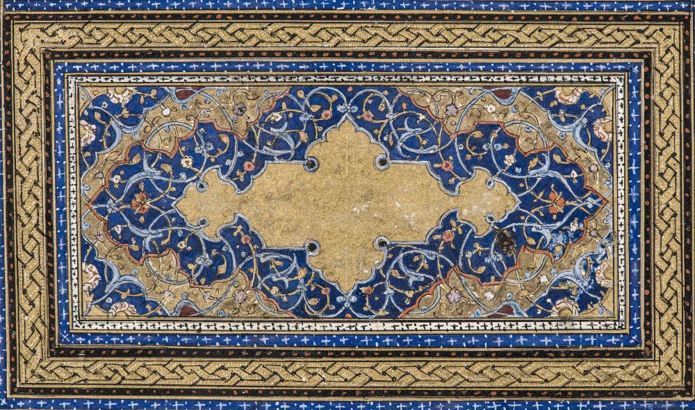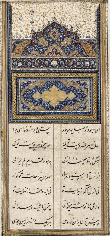 Detached page from a Shah-u-Gada manuscript. The unwân, title-page, top decoration, geometrical interplay between rectangles and lotusshaped medallions with lapis-blue and golden backgrounds. These are highlightened by polychrome floral scrolls. Beneath this decoration there is two columns of nasta’liq in a stencil of seven lines. over the unwân decoration there is a stamp of some kind. Verso is written with two columns of nasta’liq. Rigid paper album.