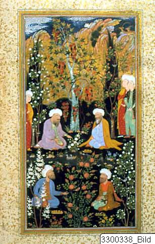 Detached page from a Shah-u-Gada manuscript. The wise men in the garden. In the background, a blue sky with chinese scroll-clouds over a golden mountin, in fron of the mountain two cypresses intertwined with almond trees and between then a platane. In front of the cypresses there are on-lookers.I In the foreground, the four wise men sit in the shape of a square discussing in a garden filled with rose, peach and almond trees, A river cuts the picture between the wise men. Is was pinted in silve, has now oxydized. Rigid paper album.