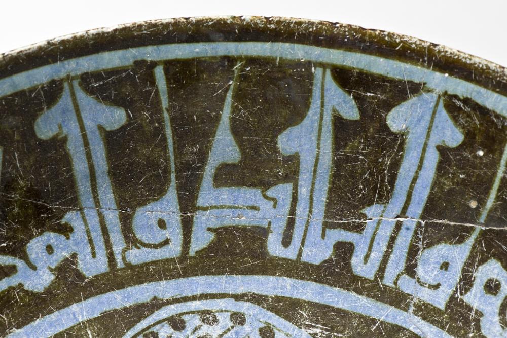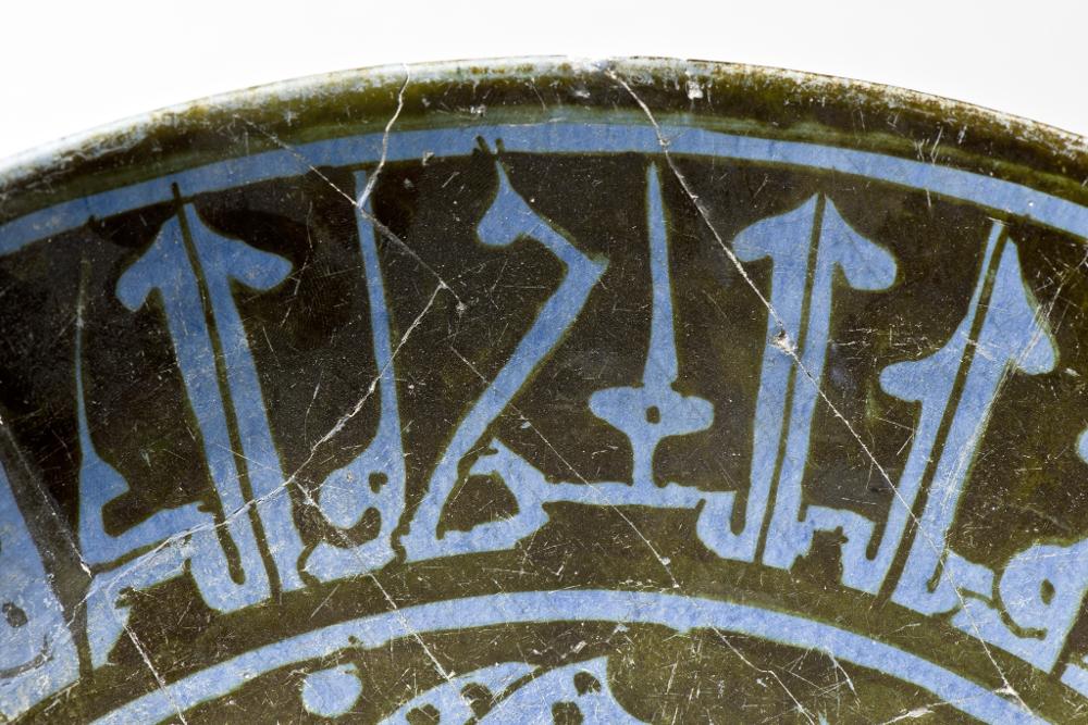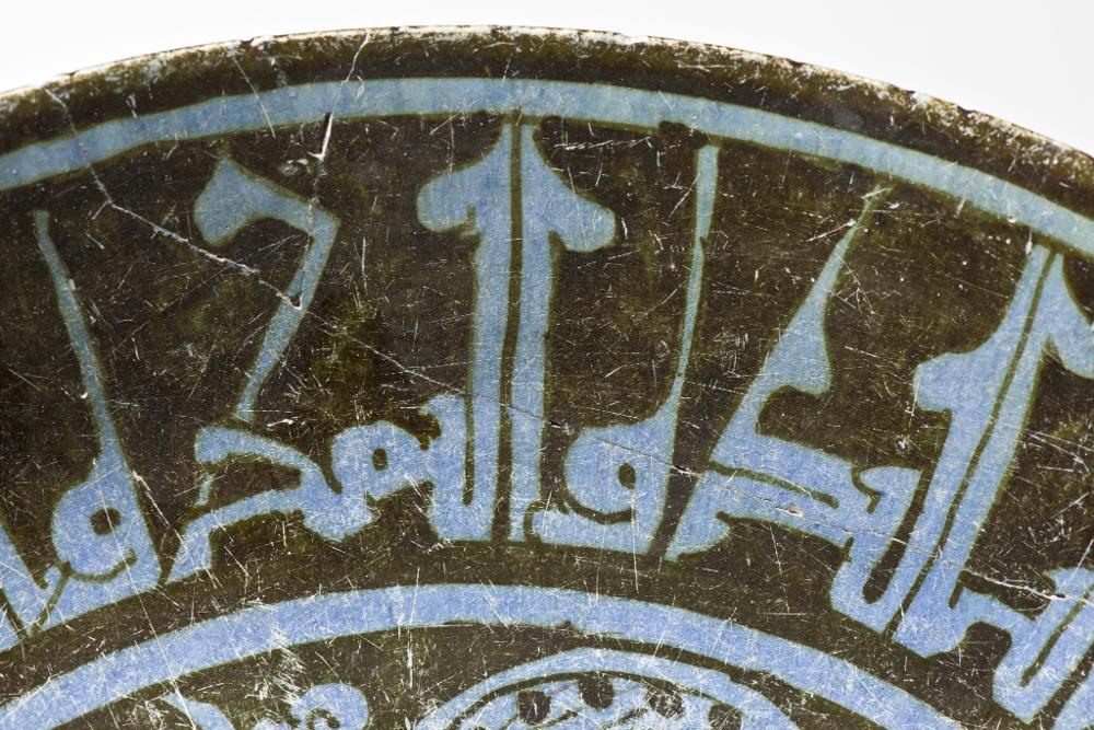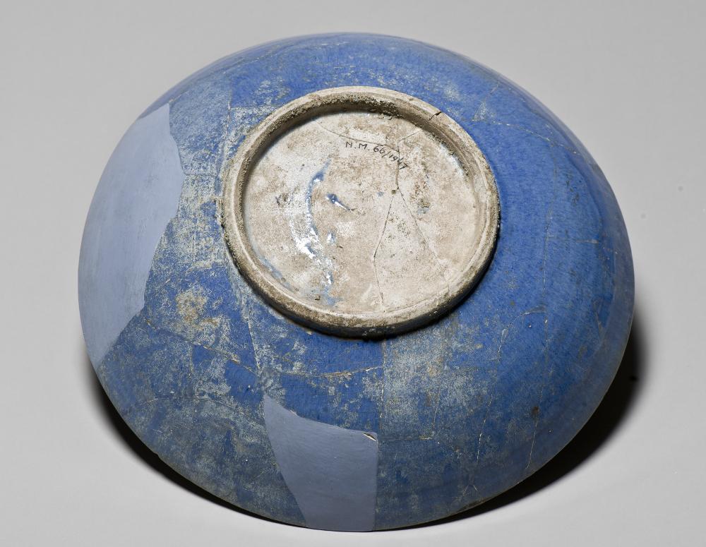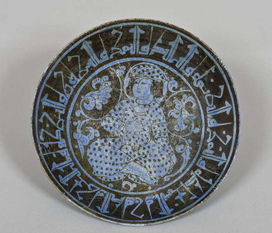 Flaring sides, straight rim, low foot. Pinkish white paste, covered with blue tin-glaze and painteds with blackish brown luster paint. Exterior, monochrome pale blue, substituted pieces painted with paler blue colour. Interior, center shows a haloed man sitting in a lotus-position, a wine-cup in his hand towards a background of vegetal scrolls. His silhuette is painted in reserve and details marked with luster paint. On the sides a cufic inscription in blue.