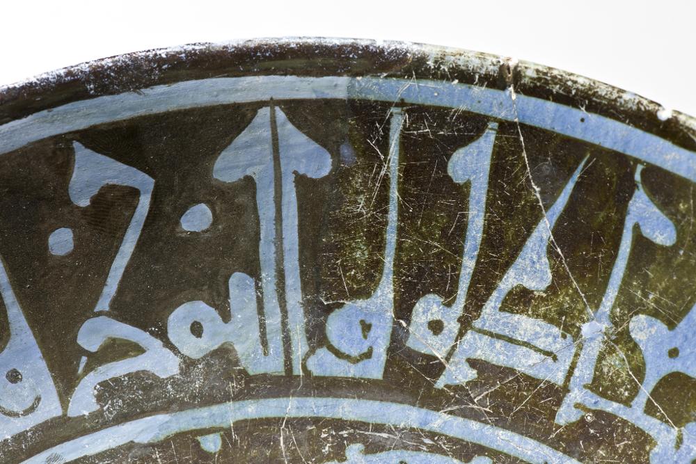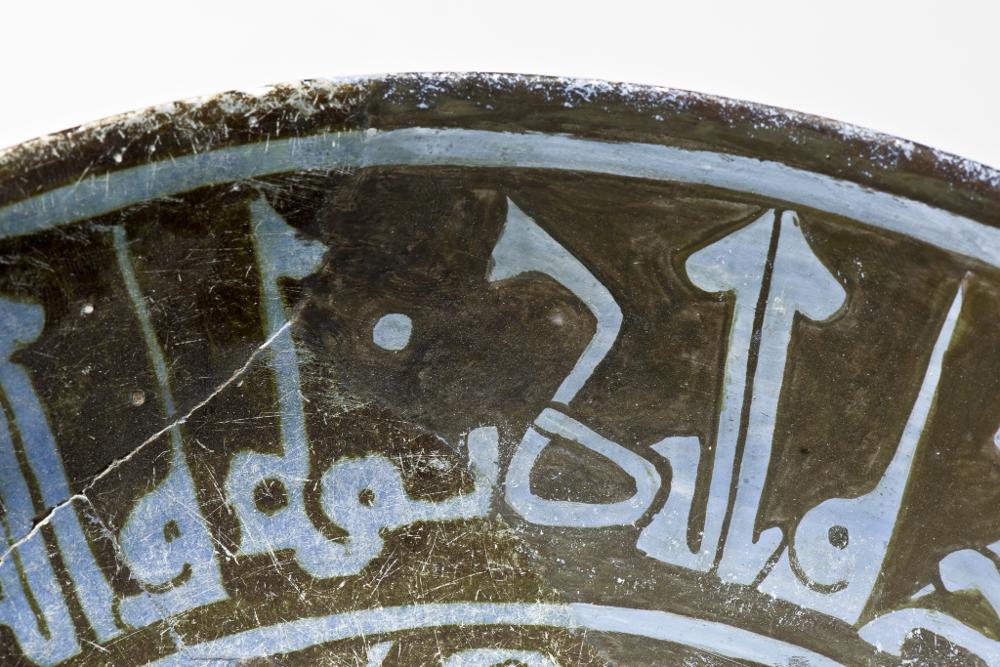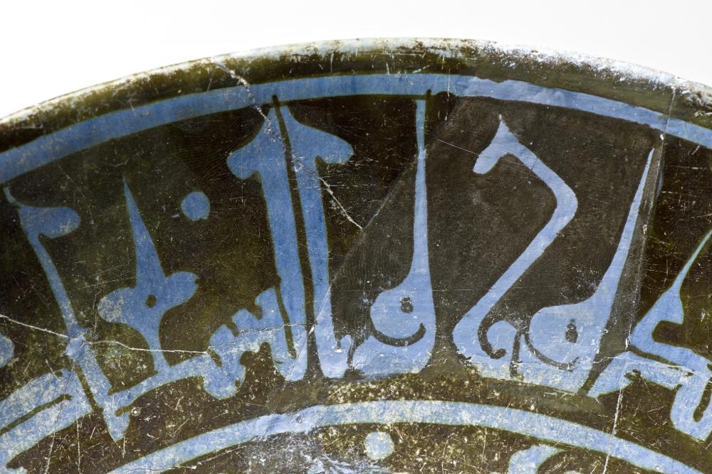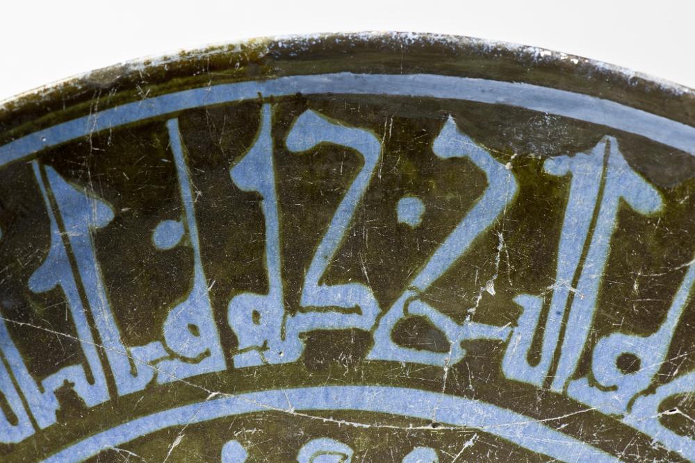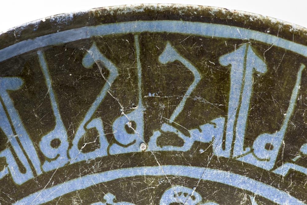 Flaring sides, straight rim, low foot. Pinkish white paste, covered with blue tin-glaze and painteds with blackish brown luster paint. Exterior, monochrome pale blue, substituted pieces painted with paler blue colour. Interior, center shows a haloed man sitting in a lotus-position, a wine-cup in his hand towards a background of vegetal scrolls. His silhuette is painted in reserve and details marked with luster paint. On the sides a cufic inscription in blue.