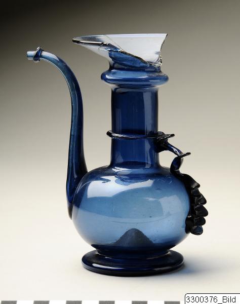 • Globular body, cylindrical neck, evased rim, s-shaped spout, handle attached to body with an undulating piece of glass and makes a circle arounf the neck. Circular foot-ring.